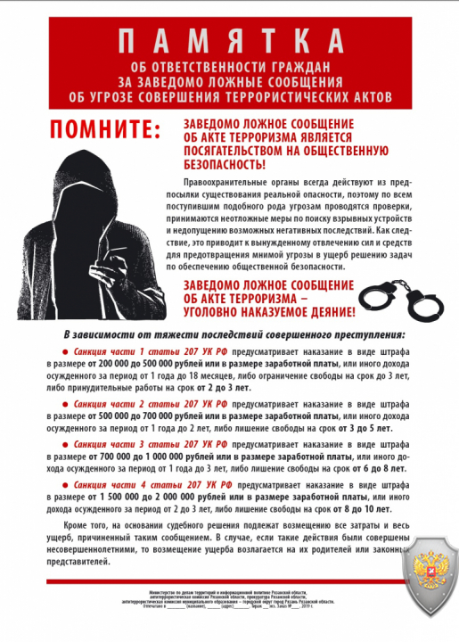 Памятка. Ответственность граждан за заведомо ложные сообщения об угрозе совершения террористических актов